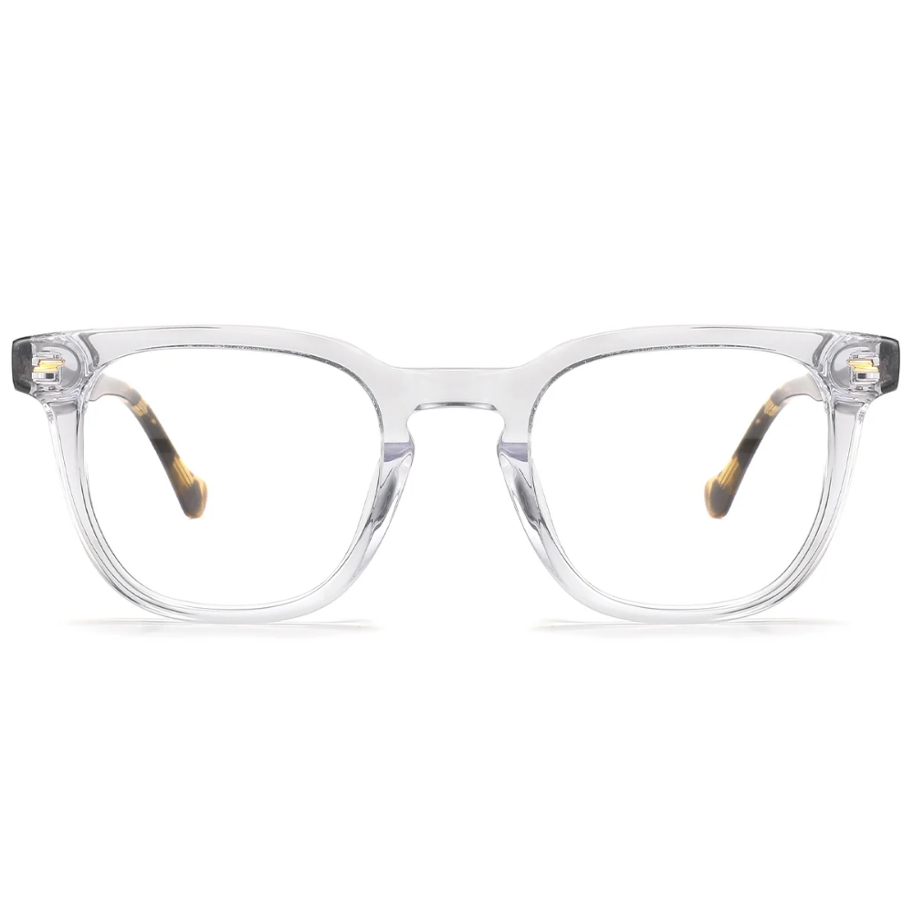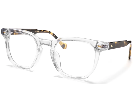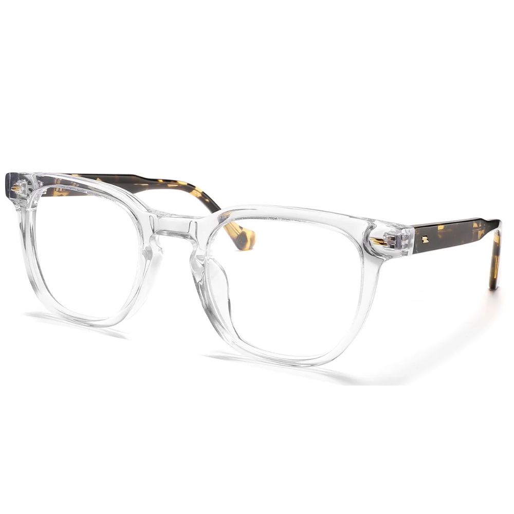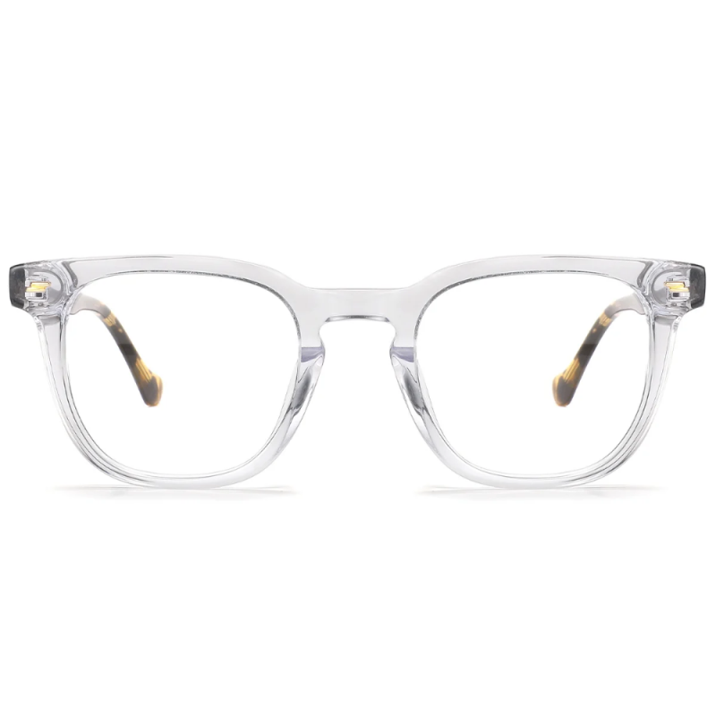 Minimalismo contemporáneo con un toque clásico. El frente en acetato cristalino deja ver la estructura y juega con la luz, mientras las varillas en carey aportan calidez y contraste.