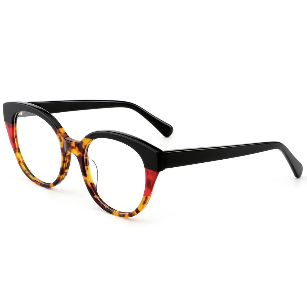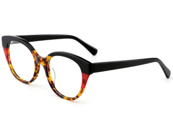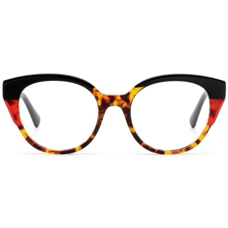 Un clásico reinventado: la parte superior en negro profundo resalta la mirada, mientras el acetato carey rojizo aporta calidez y un toque vibrante.