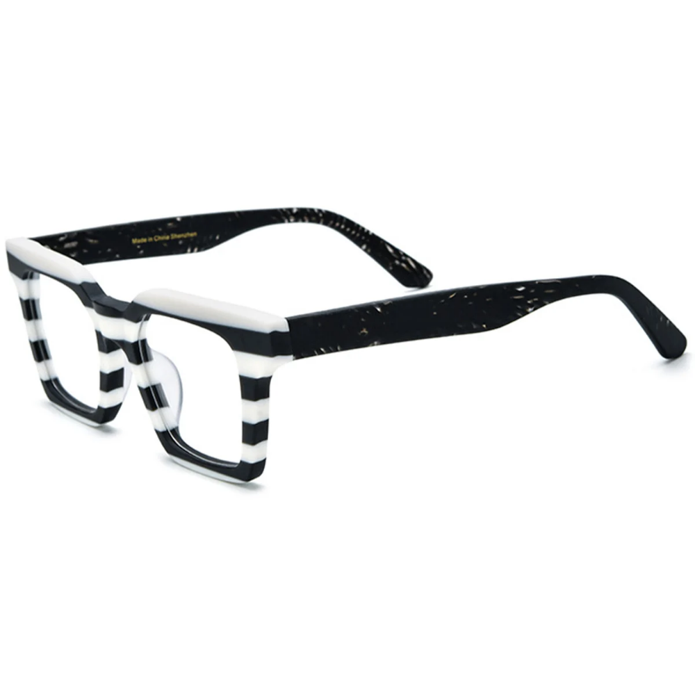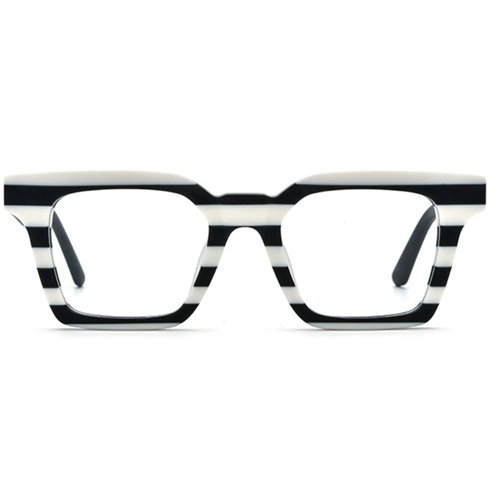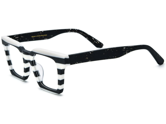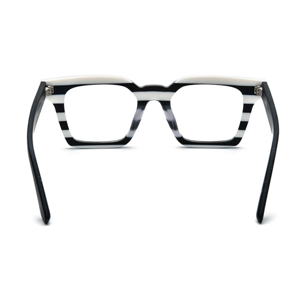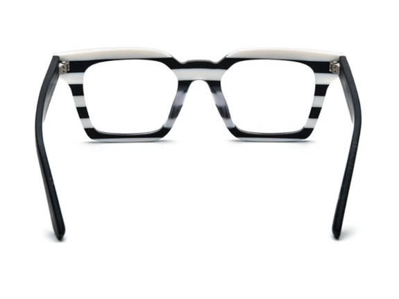 Un diseño gráfico y audaz que convierte cada mirada en una obra de arte. Su acetato italiano en blanco y negro crea un patrón de franjas horizontales único, ideal para quienes aman destacar con estilo propio.