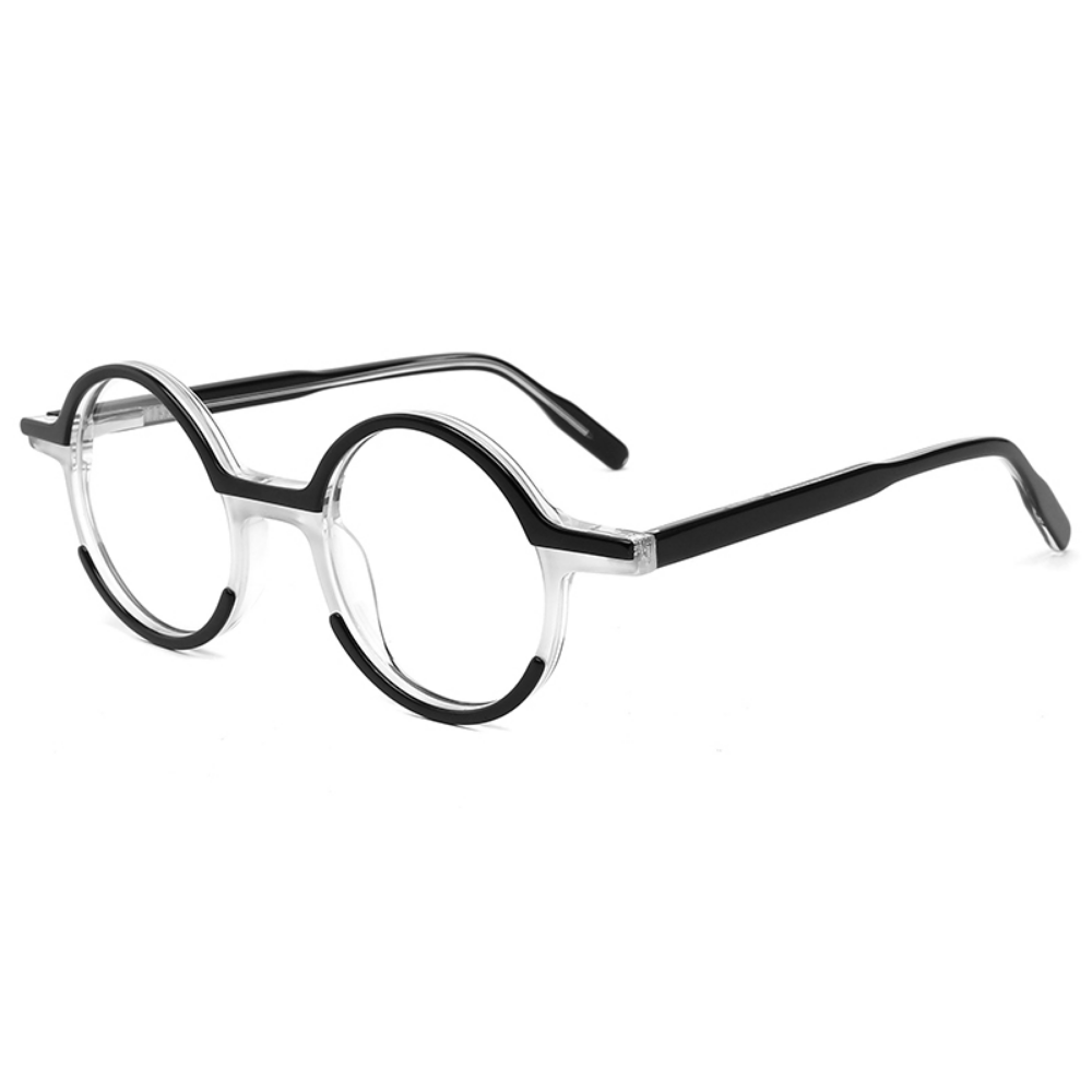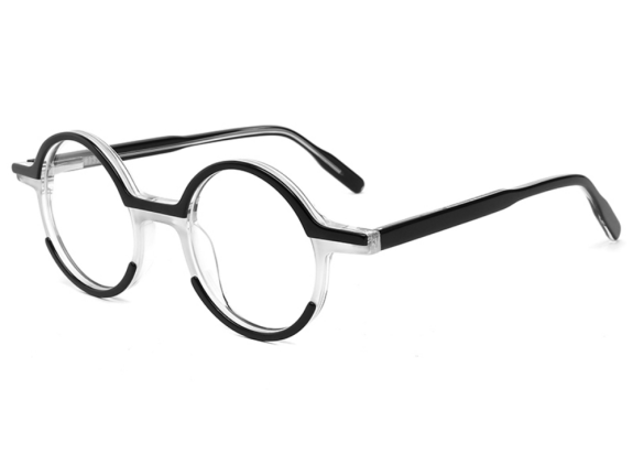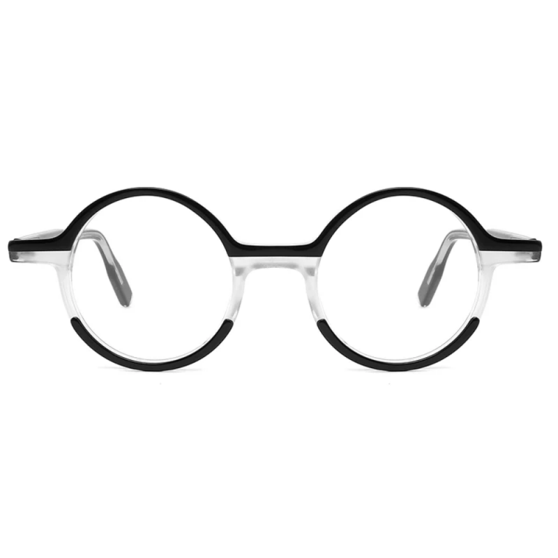 Un diseño circular que fusiona acetato transparente con detalles en negro, jugando con la luz y el contraste.